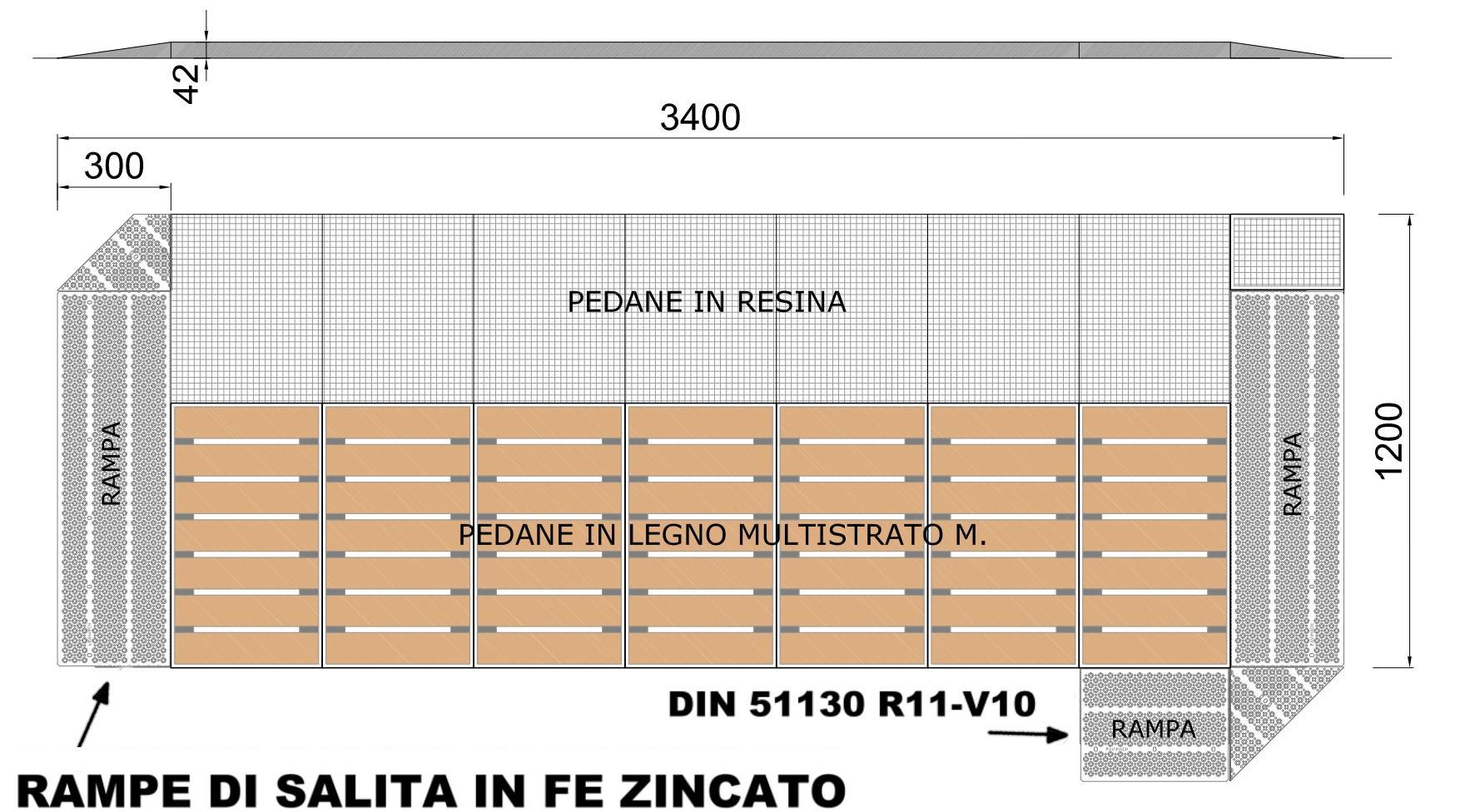 PAVIMENTAZIONE CON VASCHE DI RACCOLTA. SISTEMA COMBINATOPEDANE IN LEGNO MULTISTRATO MARINO ANTISCIVOLO DIN 51130 R11 V10PEDANE IN RESINA ANTISCIVOLO DIN 51130 R13 V10RAMPE DI SALITA IN FE ZINCATO ANTISCIVOLO DIN 51130 R11 V10